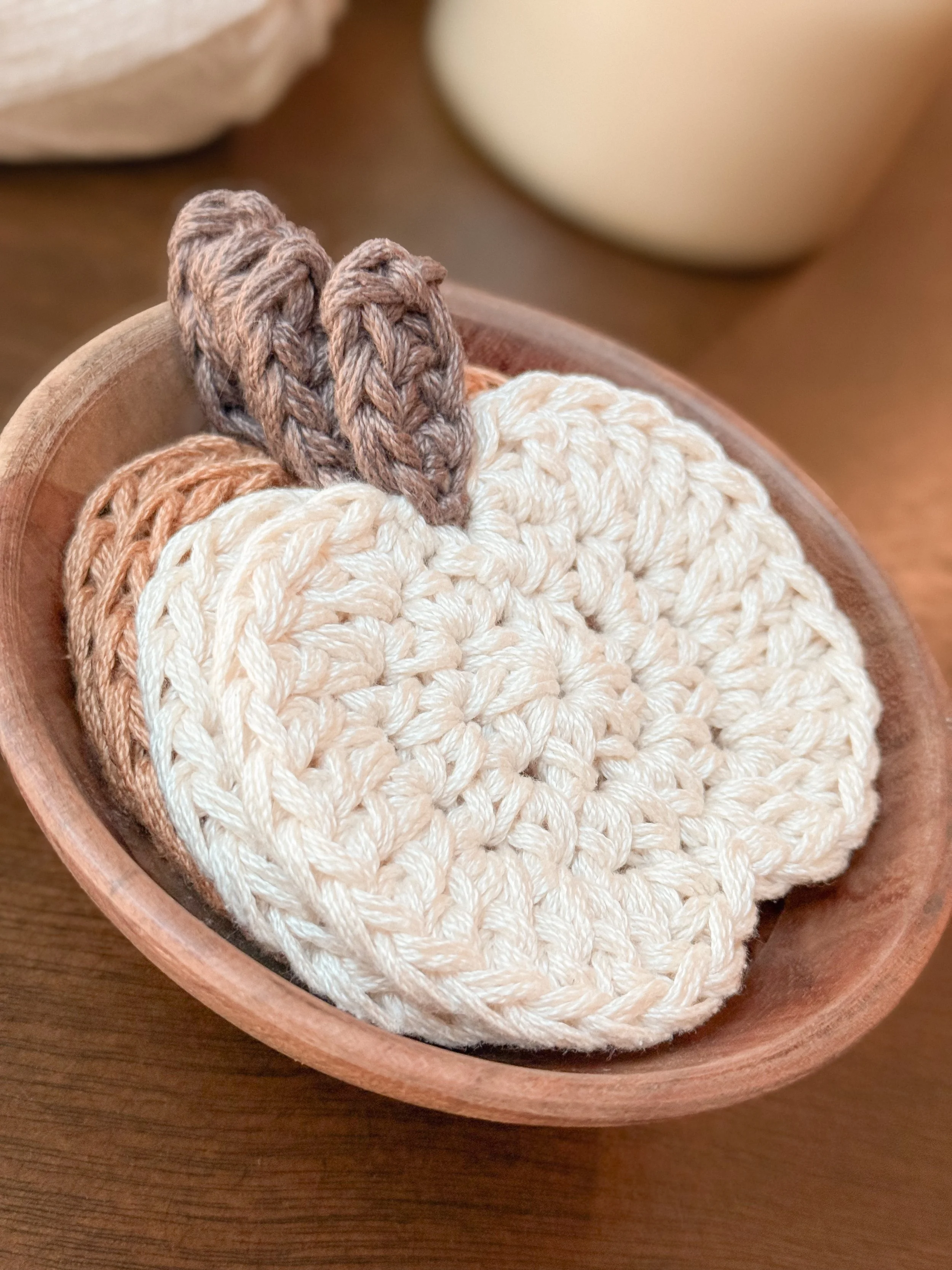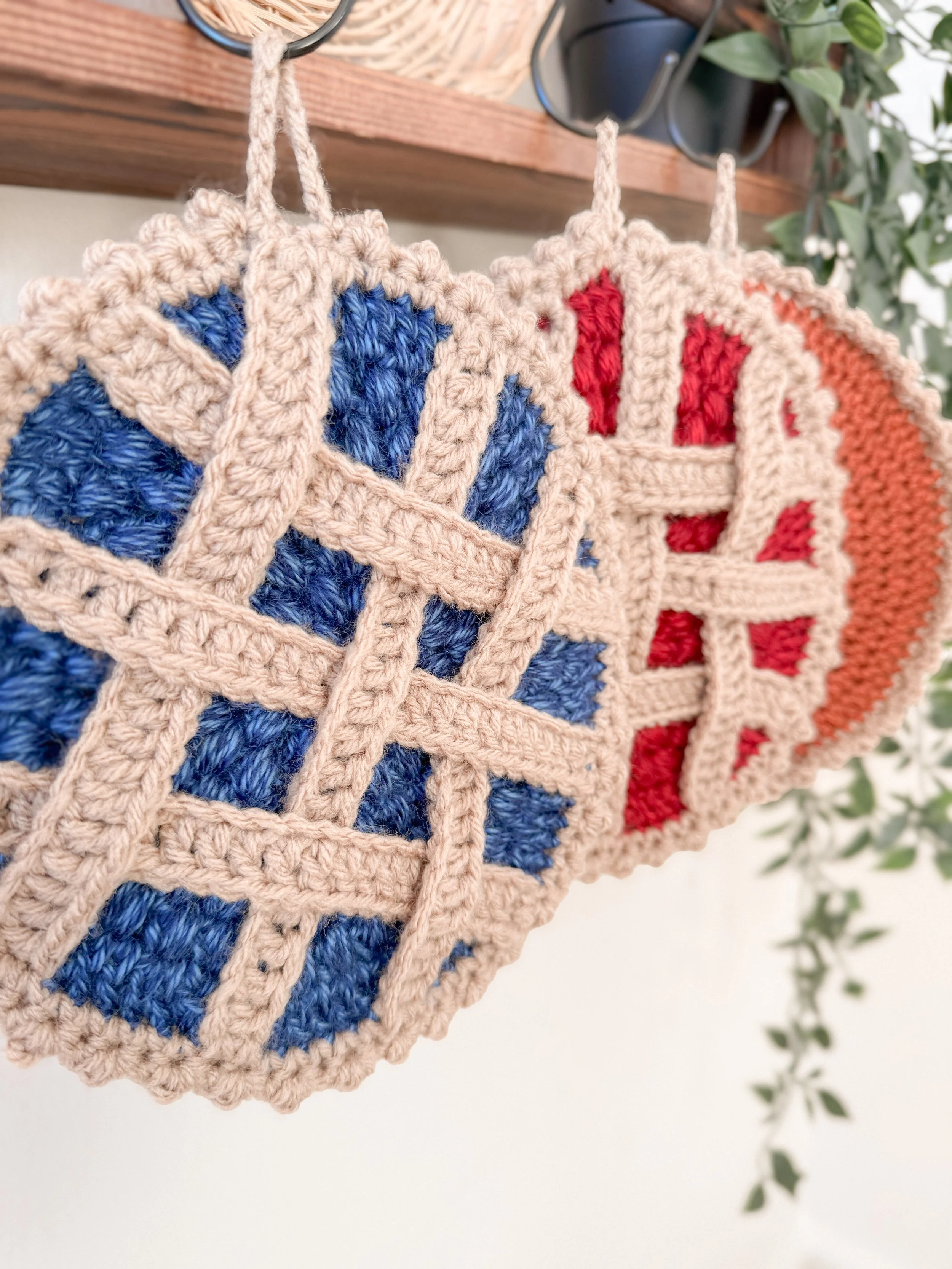 Handmade crochet pie hot pad made with soft worsted cotton blend yarn, featuring a double layer and a loop for hanging. They are practical AND gorgeous, making it the perfect gift or Fall decor!